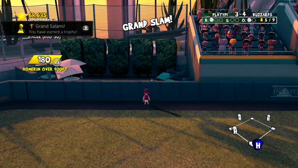 The somewhat awkward, sluggish animations and the clay-texture of the visuals, don’t match up well with the speed and parodies of names. Buttons Bunterson, number 69 for the Buzzards, runs really fast. With his orange afro and pale white skin, his appearance feels completely separate from his ability. The visual aesthetic doesn’t reflect the excitement of homeruns or triples. While fireworks pop in the sky and guitars blare, the player rounds the bases in a stiff, robotic run.